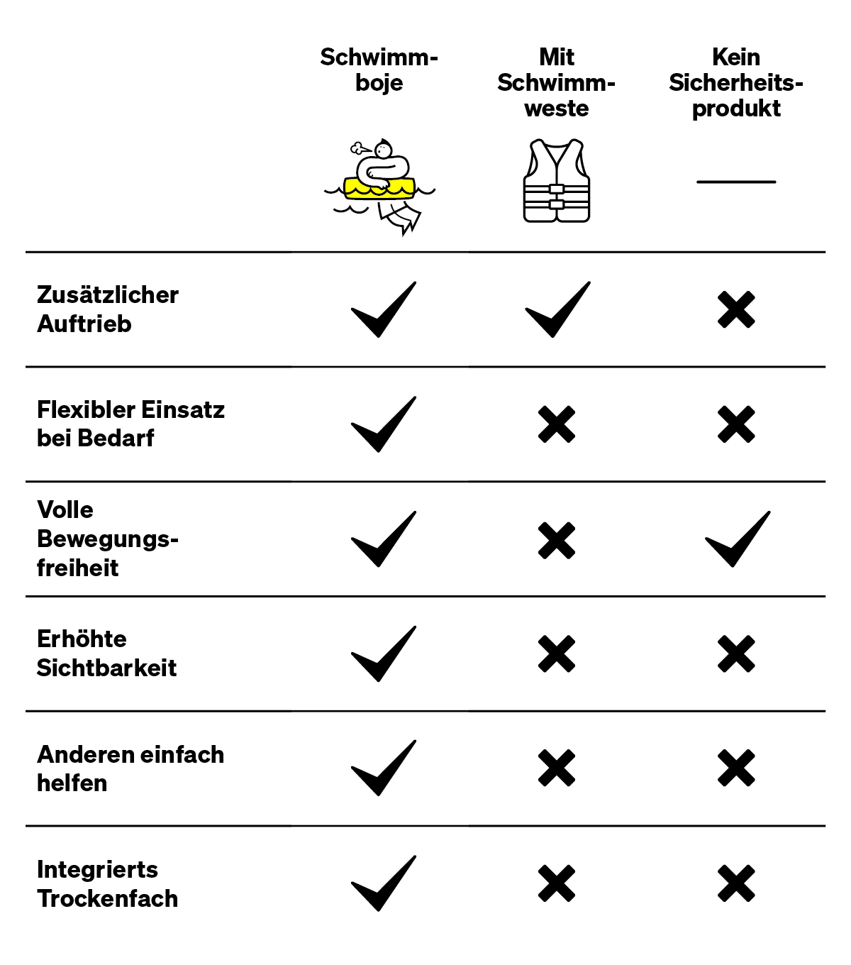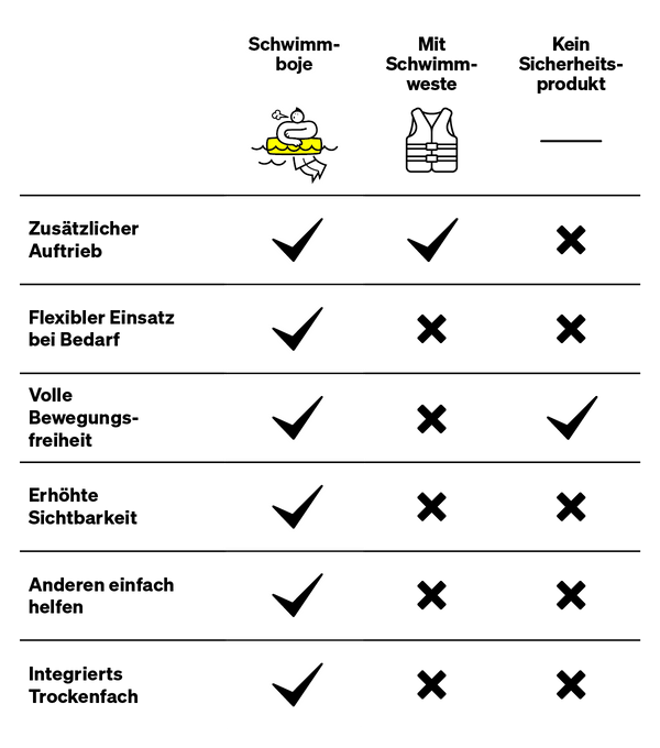 Ob für die Runde durch den See, dein Training für den nächsten Triathlon oder die lange Schwimmstrecke im offenen Meer – mit der aufblasbaren SCHWIMMBOJE bist du sichtbar, geschützt und frei unterwegs.