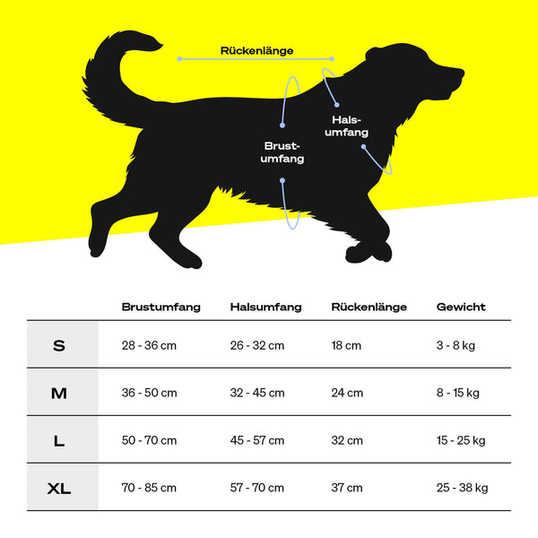 Leichte Materialien, starke Polsterung und clevere Konstruktion sorgen für sicheren, stabilen Schwimmkomfort. Die richtige Größe der Hundeschwimmweste ist entscheidend. Sie muss zum Gewicht und Körperbau deines Hundes passen. RESTUBE bietet verschiedene Größen für jeden Hund – vom Chihuahua bis zum Labrador.