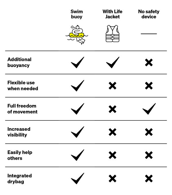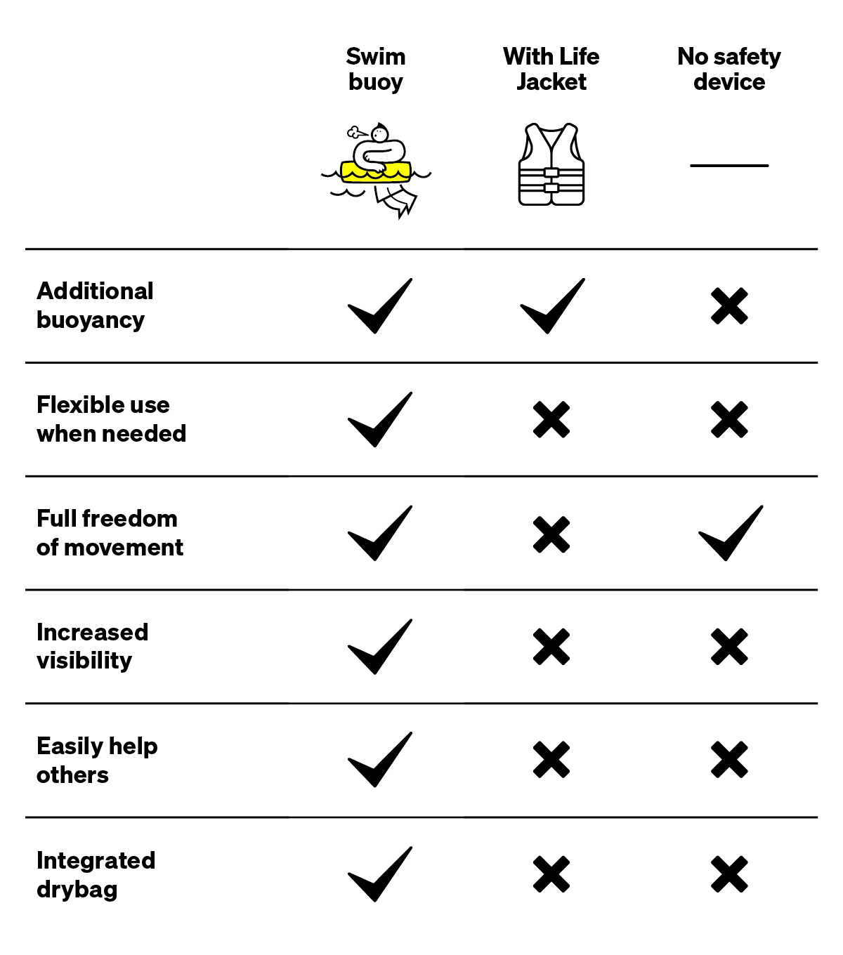 « Même avec un bateau d'accompagnement, tu nages tout seul. La bouée de sécurité RESTUBE Safety Buoy m'aide à rester concentré pendant que je nage. Ce système de sécurité super compact n'offre aucune résistance à l'eau et est super léger. Il suffit de tirer sur la goupille pour que la bouée jaune se gonfle en quelques secondes, ce qui me rassure encore plus. »