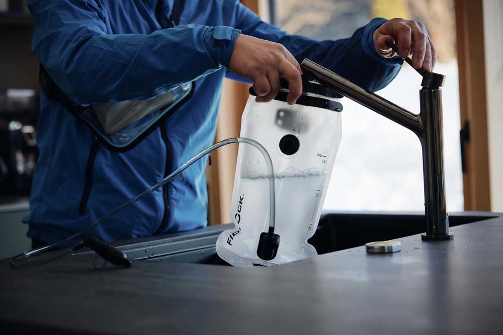 Climbing, biking or hiking - a good water supply is essential. However, you don’t want to spend a lot of time preparing? The HERMETIC HYDRATION BLADDER is filled with ease and closes immediately and securely. Thanks to the patented closure technology, easy handling is guaranteed, allowing you to start your sporting activity quickly and effortlessly. The hydration bladder has three wide-opening rows of magnets that seal automatically and hermetically – absolutely leakproof. The additional SNAP closure on the pocket flap can be operated with one hand and prevents unintentional opening of the hydration bladder in the backpack during activities.